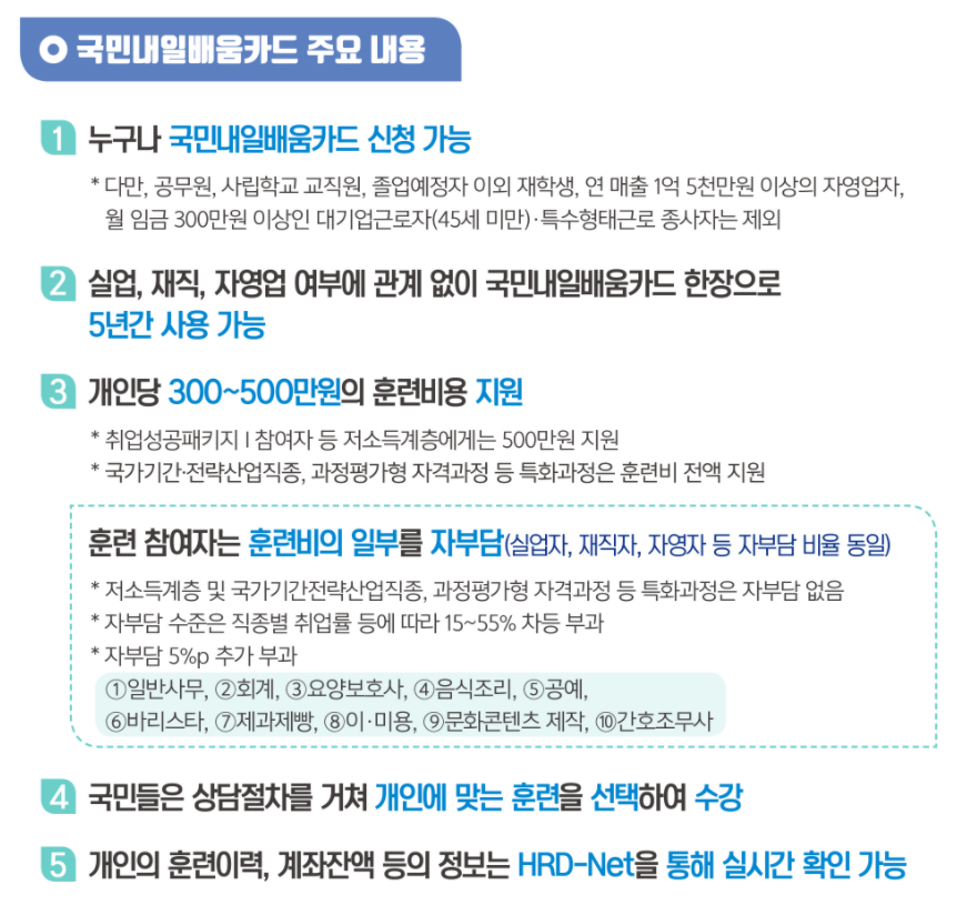 국민내일배움카드는 공무원, 사립학교 교직원, 졸업예정자 이외 재학생, 연 매출 1억 5천만원 이상의 자영업자는 제외된다.